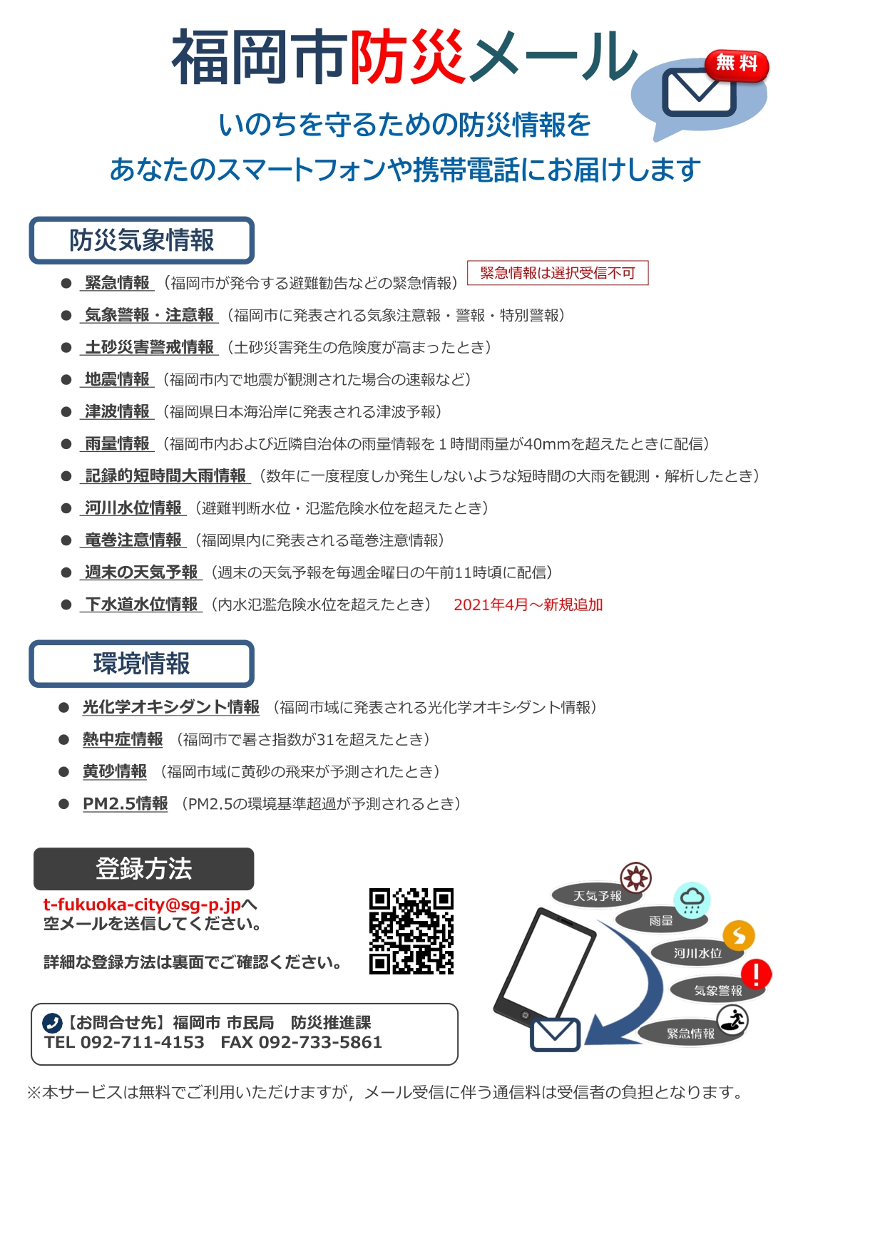 登録をおすすめします 2025.03.21 福岡市では、緊急情報や気象警報をお知らせする「防災メール」を配信しています。災害への日頃の備えとしてご登録をお願いします。福岡市外または他県在住の方も、この機会にぜひお住まいの地域にて同様のサービス等をご確認くださいますようお願いします。