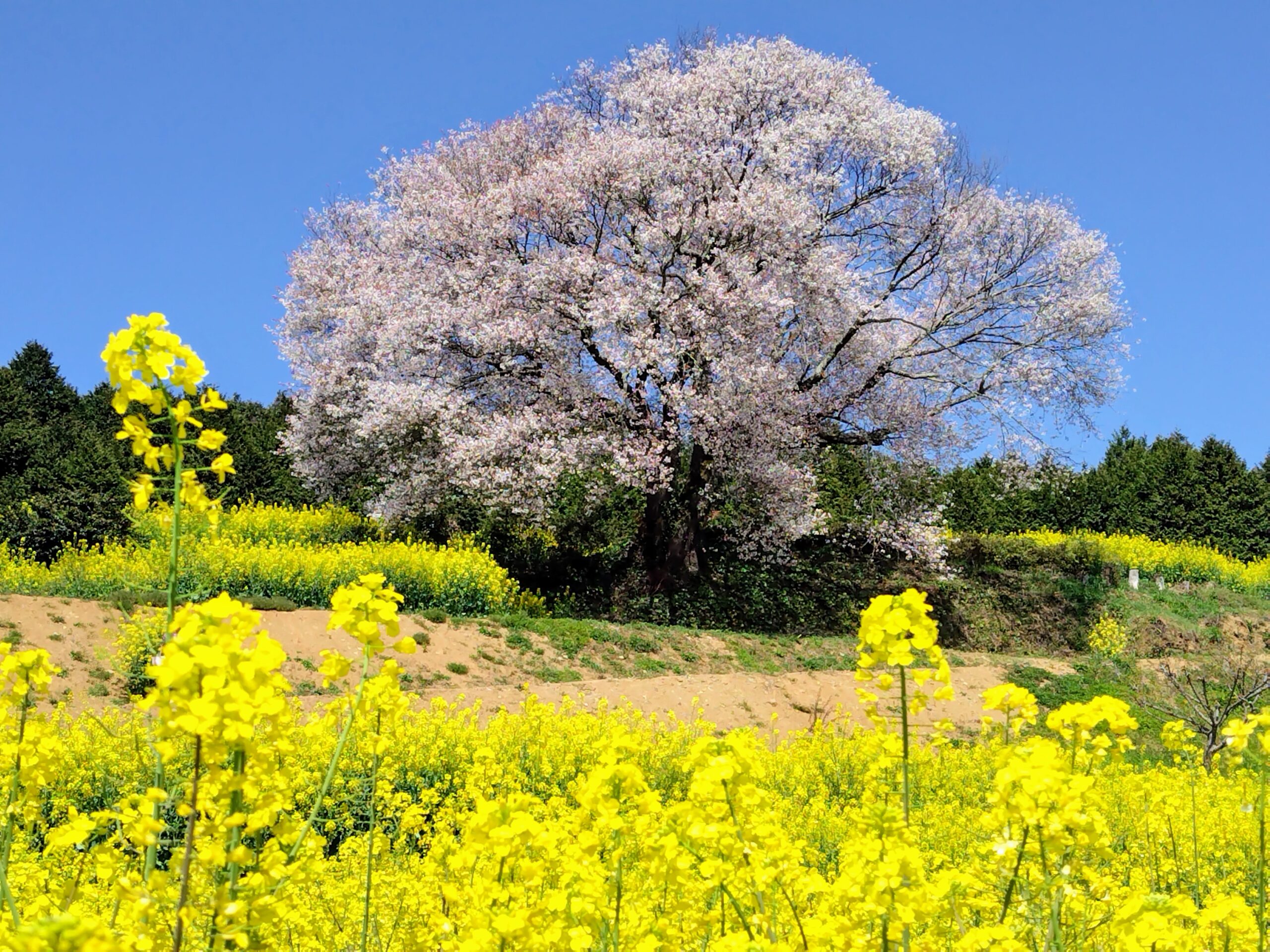 桜のピンクと菜の花の黄色、そして何より空が青くないと成立しない絶景。