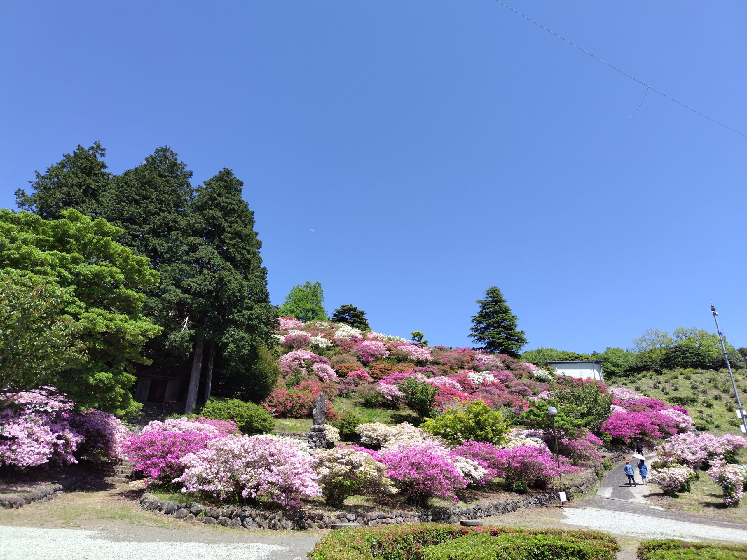 標高約400mの展望台まで息も絶え絶えに登りきると、手前には10000本のツツジ。